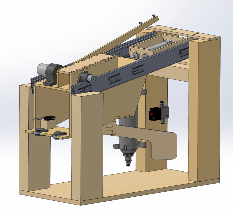 This is the robot design my team arrived at that we believed best completed the tasks required in the final competition. Modeled in SolidWorks, the design consisted largely of laser cut MDF. This made the overall design simple and reliable to manufacture as we progressively developed the design and changed it over the course of the semester. The overall system was controlled using an NI myRIO programmed in LabVIEW. The robot used drawer slides to extend onto the competition area, triggered with two pneumatic pistons. Switches, motors, and a solenoid on the front of the extended subassembly then allowed the robot to complete the required tasks during the competition.